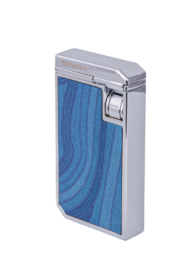 Parmida Çift Torch Pürmüz Mavi-Gümüş Metal Puro Çakmağı, modern tasarım çizgileri ile klasik detayları bir araya getirerek puro severler için hem estetik hem de işlevsel bir deneyim sunar. Şık mavi ve gümüş renk uyumu, ahşap desenli yüzey kaplamasıyla birleşerek çakmağa karakteristik ve dikkat çekici bir görünüm kazandırır.
